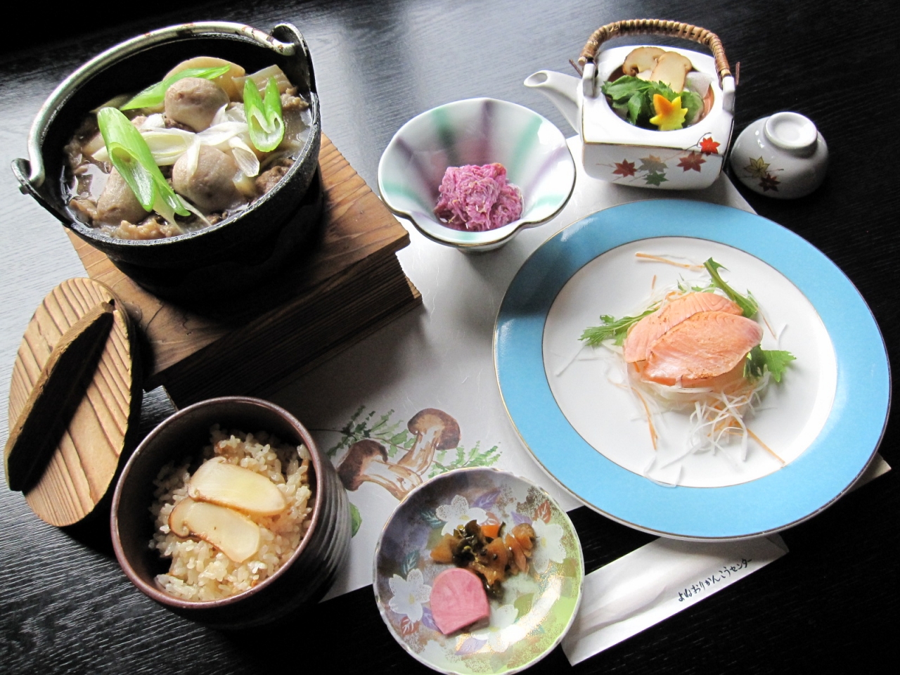 いも煮、マツタケご飯、マツタケ土瓶蒸しがセットになった